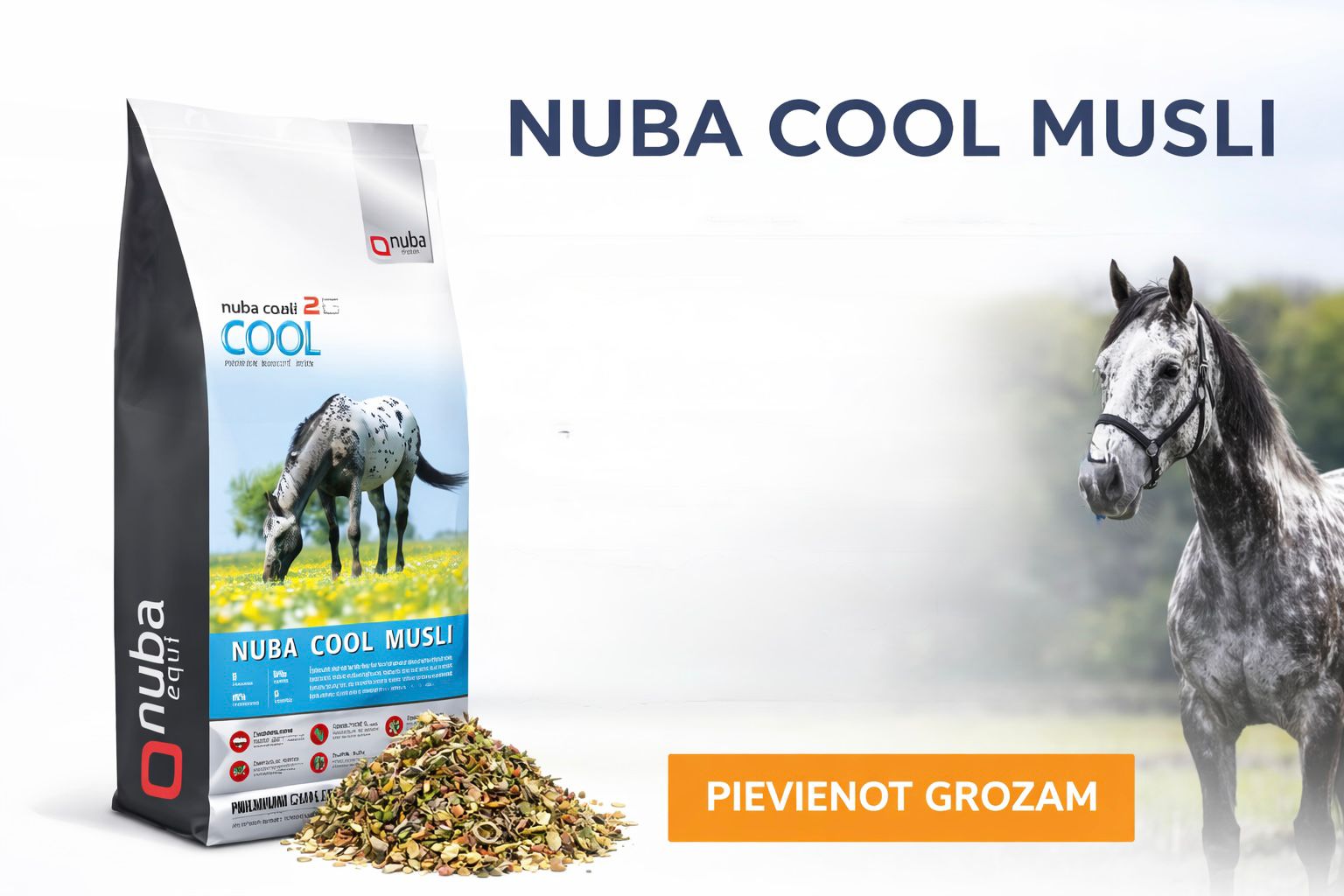 Nuba Cool Musli ir sabalansēta barība zirgiem, kuriem nepieciešama mazāka enerģija, bet pilnvērtīgas uzturvielas organisma veselībai un muskuļu uzturēšanai.